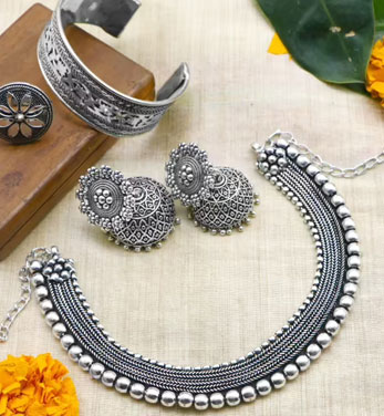 Each piece is an ideal choice for both contemporary and ethnic outfits, adding an extraordinary appeal to the character of the wearer. Both, wearing jewellery and the holy status of gold and silver, have a continuous history of millennia in India. It is our duty to introduce an extensive variety of conventional, fine silver gems and present-day silver adornments from across India. With their interesting motivations, and themes, our assortment of high-quality silver gems is perfect for our intimate occasions! We sell genuine silver pieces that are particularly intended to give an imperative inclination to the person who wears our pieces. We bring to you a shining market highlighting an assortment of hand-tailored silver gems produced using sparkling silver and gold-plated silver base. This choice reach adds a hint of fabulousness to ethnic or western outfits.